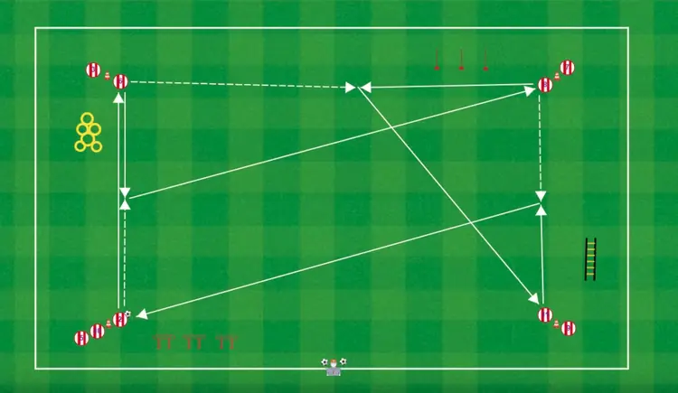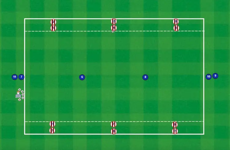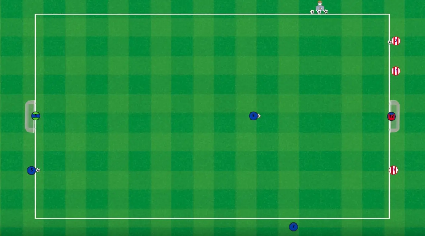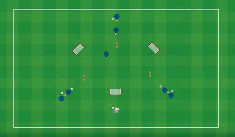 Objetivo: tiro a porteria, trabajo para porteros, distintas posiciones de finalización, pases cortos y controles previo al disparo a porteria.