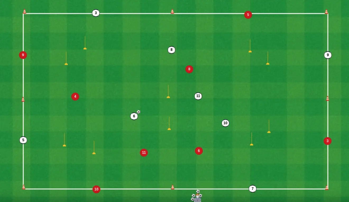 descripción objetivo ejercicio: Situaciones de superioridad numérica en el centro del campo, con transición de espacio hacía zona de finalización. Press perdida en zona de finalización.