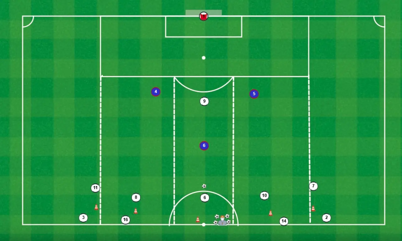descripción objetivo ejercicio: situaciones de repliegue en bloque bajo en inferioridad numérica y salida al contrataque con 3 jugadores descolgados contra 2 defensores